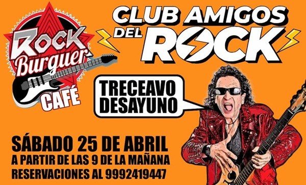 El sábado 25 de abril se realizará el treceavo desayuno del Club Amigos del Rock, reuniendo a amantes de este género musical que se mantiene vigente con una historia que abarca más de 60 años. Como de costumbre, la sede será Rock Burger Café, ubicado en la calle 43 número 397 x 24, de Pedregales de Tanlum, en la ciudad de Mérida, Yucatán.
