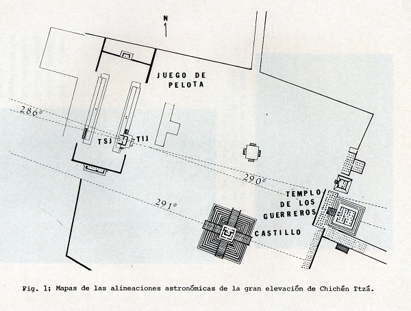 EL CENIT Y EL NADIR SOLARES EN LA ARQUITECTURA DE CHICHEN ITZÁ. El nadir solar puede haber tenido la misma importancia que el cenit en la orientación de los edificios de Chichén Itzá. El nicho de la escalera y la ventana No. 1 de la torre del Caracol están orientados hacia la puesta del sol en el momento del cenit solar (Aveni 1980: Figs. 91-93). El Templo de los Guerreros y la fachada oeste del Castillo tienen la misma orientación: hacia la puesta del sol en el momento del cenit de mayo y de julio, mientras que la fachada este del Castillo a 180 grados de esta dirección hacia la salida del Sol en el momento de los nadires de noviembre y enero (2).