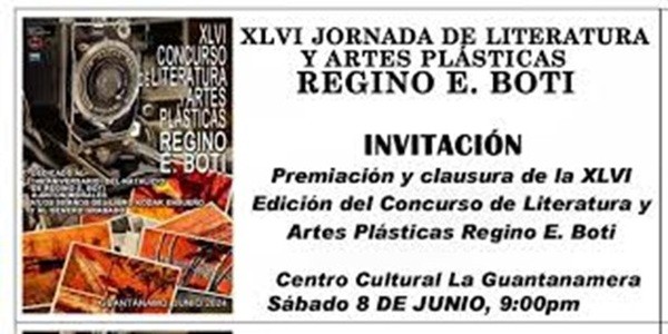 La XLVI edición de la Jornada de Literatura y Artes Plásticas Regino Eladio Boti, que tuvo lugar del 5 al 8 de junio, propuso un programa de paneles, conferencias, exposiciones y conversatorios enfocados en los aportes del ilustre guantanamero en la enseñanza artística y su impronta en la cultura local. El evento, en esta ocasión se dedicó al aniversario 146 del natalicio de Regino E. Boti, al 95 aniversario de los libros Kodak ensueño y Rumbo a Jaruco, Prosas Emotivas, a la obra de Antón Morales y al género Grabado