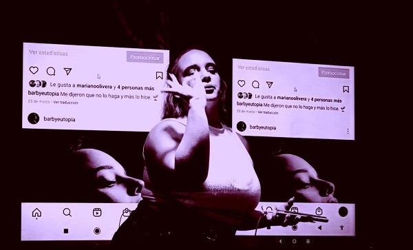 La obra, dirigida por Mariano Olivera e interpretada por Gabriela Jiménez, presenta al personaje y su relación con el mundo digital por medio de una doble proyección en la que se observa todo lo que realiza en su smartphone, llevándonos por un laberinto de publicaciones en tiempo real. Sumado a esto, el diseño sonoro está a cargo de Diego Cano, que parte del sonido que generan las aplicaciones y plataformas.